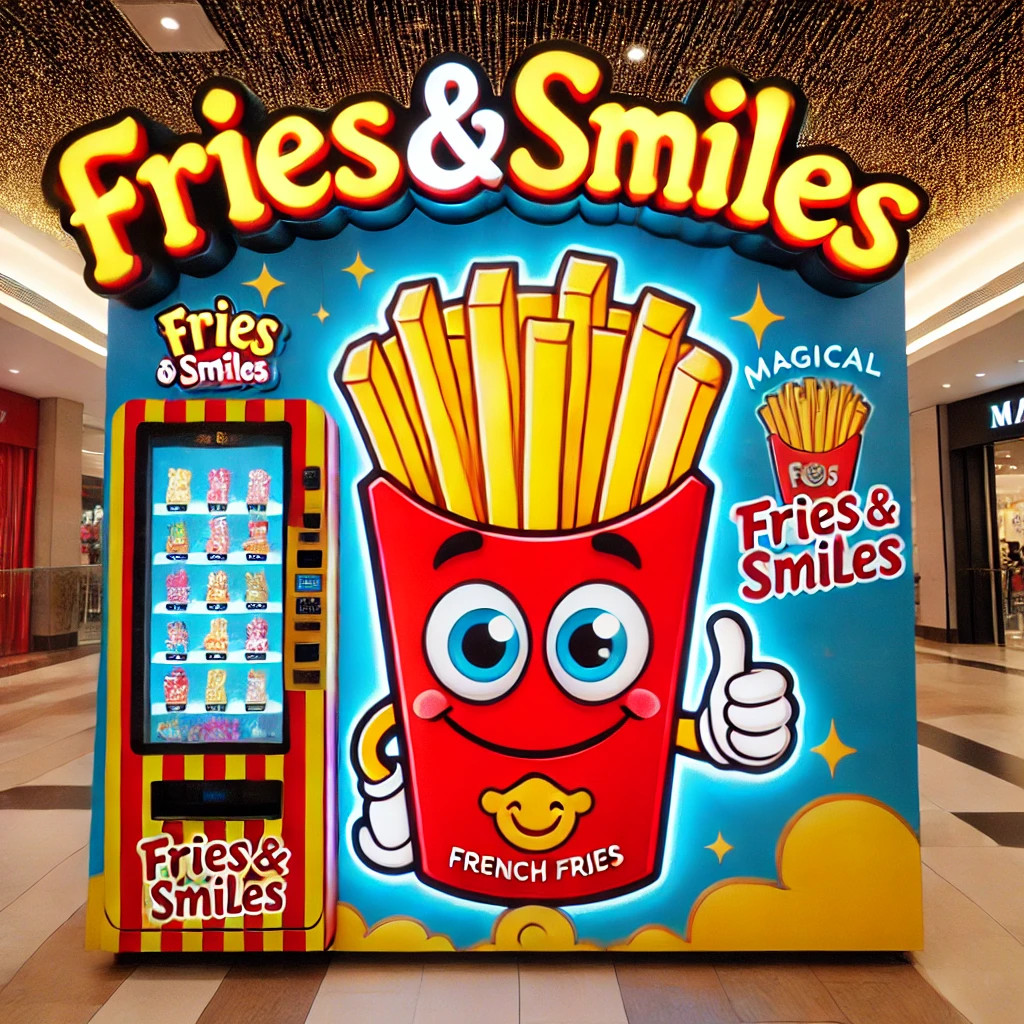 Objevte jedinečný zážitek s naším automatem Fries & Smiles! Tento kouzelný stroj vám během okamžiku připraví dokonale křupavé hranolky s úsměvem navíc. Díky jeho veselému designu a ikonickému maskotovi se stává nepřehlédnutelnou atrakcí. Přijďte ochutnat radost v každém kousku – s Fries & Smiles bude váš den chutnější a veselejší!